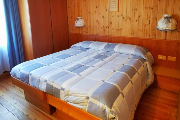 Camere doppie o matrimoniali, arredate in stile montano con finiture in legno dal gusto sobrio ed essenziale, situate al primo e al secondo piano della baita.